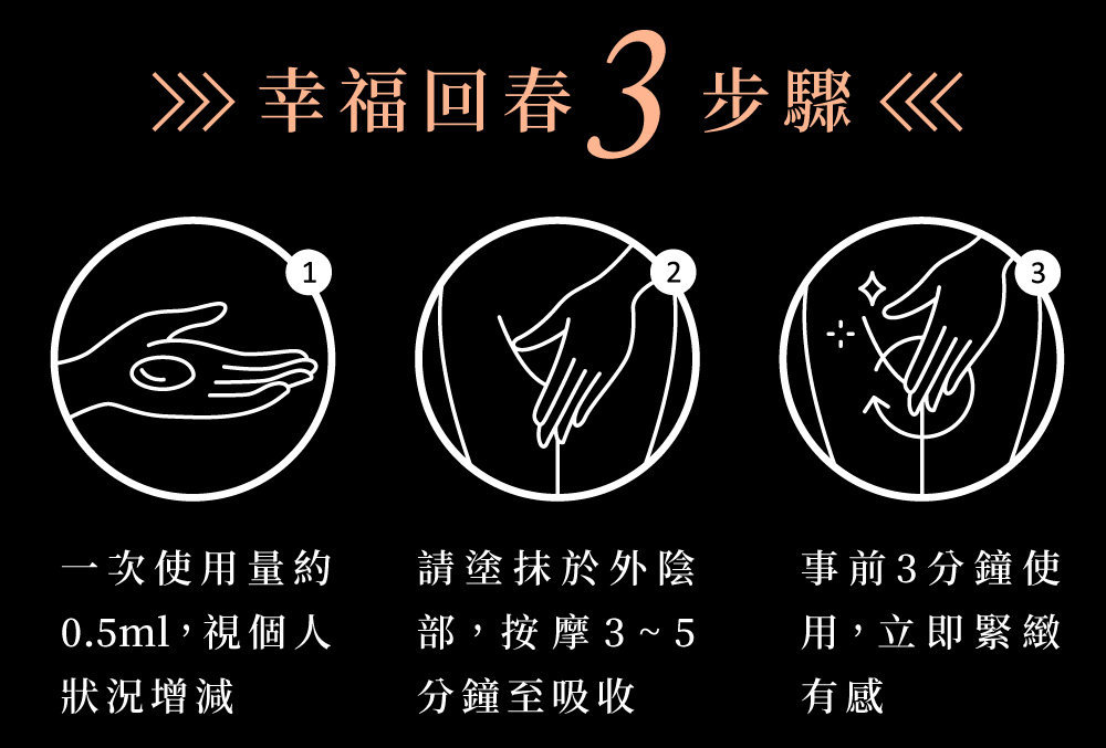 建議沐浴清潔後,取0.5ml均勻擦在外陰部,輕輕按摩,始凝膠完全被肌膚吸收,識個人情況,可酌量增加用量,恩愛前三分鐘輕輕按摩效果更佳。